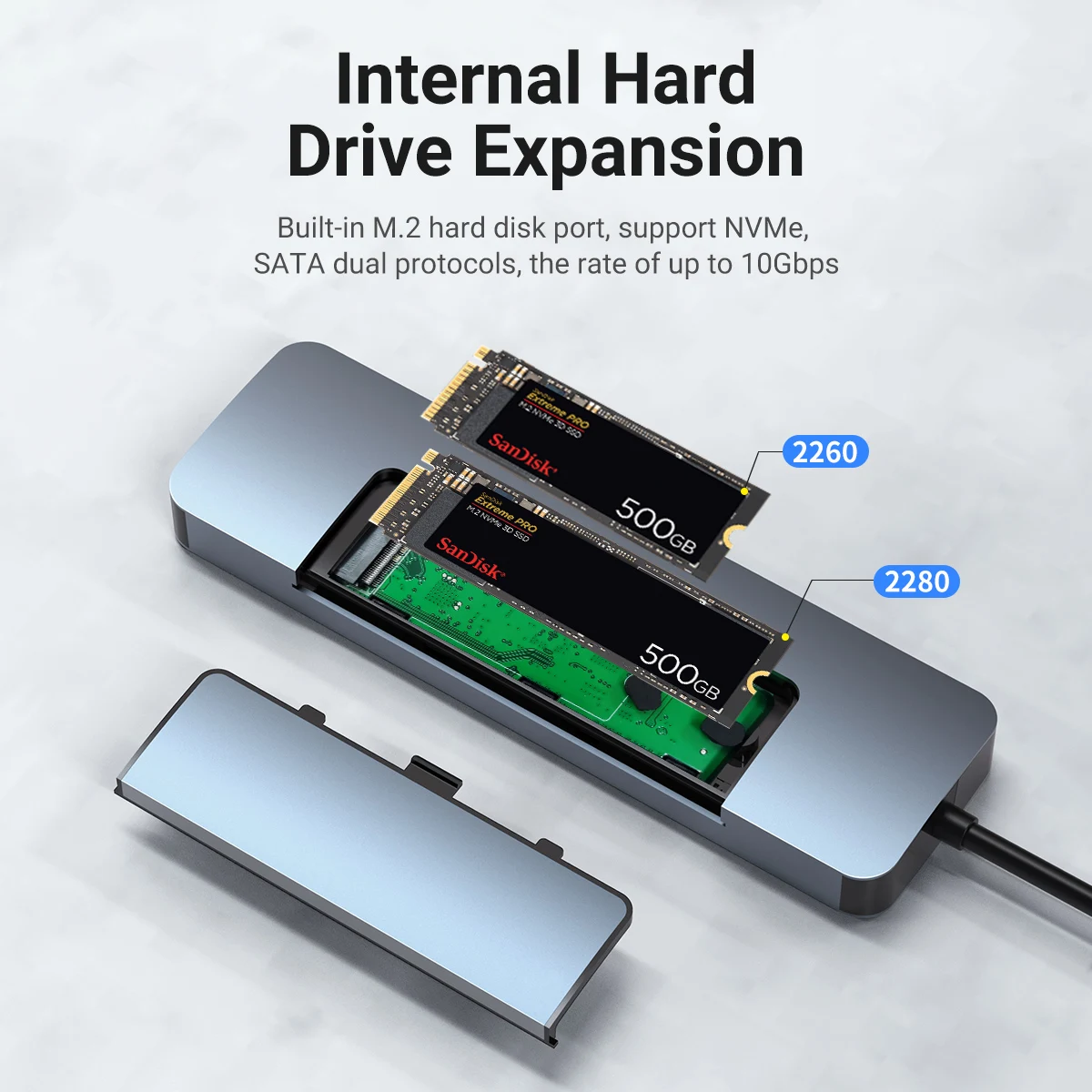 It’s not just a hub; it’s a gaming command center that combines essential connectivity with an integrated M.2 NVMe/SATA SSD enclosure.